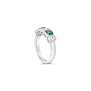 A Fairfax & Roberts handmade ring featuring alternating asscher cut diamonds and Columbian emeralds. Mounted on an 18ct white gold setting, the gallery features ten round brilliant cut diamonds.