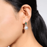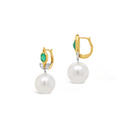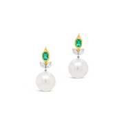 Muzo emeralds from the Colombia Andes region are respected and desired for their vibrant and intense depth of colour saturation and untreated status. These earrings are crafted with Colombian Muzo emeralds, marquise cut diamonds complete with Australian South Sea pearls set in 18ct white and yellow gold.