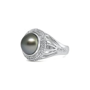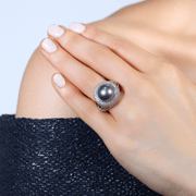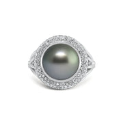 Lantern Collection ring featuring a 12mm Tahitian cultured pearl surrounded by round brilliant cut diamonds. Crafted in 18ct white gold.