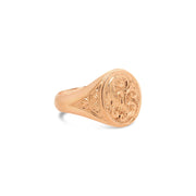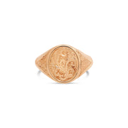 Classic oval signet ring featuring a small portrait facing oval signet face with engraved shoulders and traditional scroll designs. Crafted from 18ct rose gold.