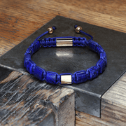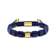 A modern style bracelet featuring blue lapis lazuli gemstone beads threaded on a blue cord. The bracelet is secured with an IP yellow gold plated stainless steel lock.