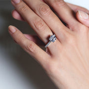 The central stone is delicately framed by fine metal claws, a reflection of the symbiotic nature of true love, where support and individuality coexist. The castle-set diamond creates an effortlessly shimmering effect exuding a modern and timeless allure.