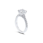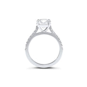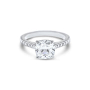 A timeless cushion-cut diamond engagement ring featuring a four claw set central stone mounted on a round brilliant cut, castle set diamond band.