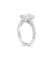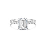 A timeless emerald-cut diamond engagement ring featuring a four claw set central stone mounted on a round brilliant cut, castle set diamond band.
