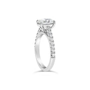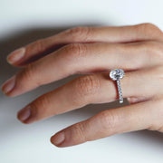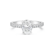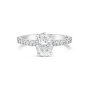 A timeless oval cut diamond engagement ring featuring a hero gemstone mounted on a round brilliant cut, castle set diamond band.