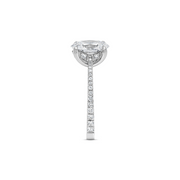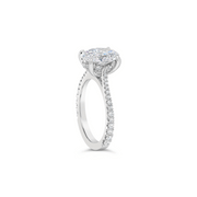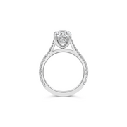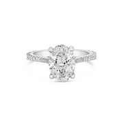 A timeless oval cut lab grown diamond engagement ring with a six claw setting elegantly mounted on an taped band set with round brilliant cut, castle set diamond band.