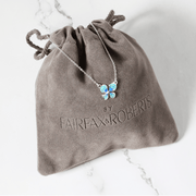 The necklace design was a collaboration between Fairfax & Roberts and the Butterfly Foundation. The butterfly motif and blue enamel inlay is inspired by Butterfly’s logo. The butterfly symbolises the ongoing transformative journey of life, particularly for those who recover from an eating disorder. The shape of the wings are reminiscent of speech bubbles, reflecting Butterfly’s commitment to change through conversations that are meaningful, understanding, informed and persuasive. Each necklace includes a 10cm extension chain.