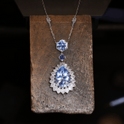 Transporting you back to the shore of crystal waters, this necklace is a bespoke piece designed and crafted by our master jewellers. The striking blue hue of the 10.73ct pear cut and 2.93ct hexagonal cut aquamarine gemstones captivates you and draws you into their natural beauty. Framed with a halo of diamonds and a touch of Ceylon blue sapphire.