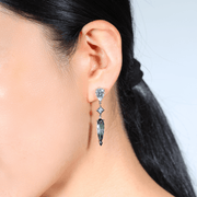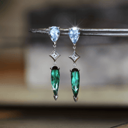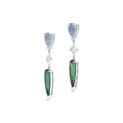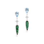 A pair of pendant style earrings featuring pear shaped aquamarine and green tourmaline gemstones separated by a carre cut diamond. Crafted in 18ct white gold.