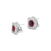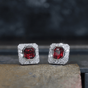 Fairfax & Roberts designed and made earrings featuring square, emerald cut, certified Burmese red spinel gemstones surrounded by round brilliant cut diamonds complete with milgrain detailing. Crafted from 18ct white gold, the earrings are secured with a post and omega hinged fitting.