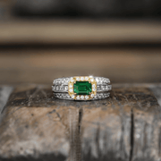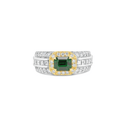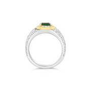 A striking ring featuring a central emerald cut tsavorite garnet set in four claws surrounded by a halo of round brilliant cut and carre cut diamonds mounted on a graduating diamond band. Crafted in 18ct white and yellow gold.