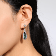 These timeless pendant-style earrings feature captivating drop shape green tourmalines framed by pavé set round brilliant cut diamonds further highlighting their beauty. Each drop is suspended from hexagonal shaped pavé set diamond stud. Crafted in 18ct white gold.