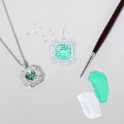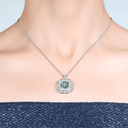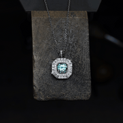 Handmade in our workshop, the beauty of this 4.95ct square emerald cut mint tourmaline is enhanced with a double halo of mixed-set round brilliant cut diamonds. The intricate detailing of carre-cut diamonds in the gallery add a sophisticated element as the pendant sparkles from an articulated thread-set diamond bale.