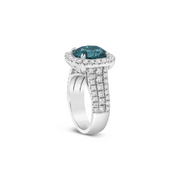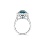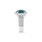 An exquisite masterpiece featuring a captivating 6.78ct cushion cut intense blue zircon framed by a halo of castle-set diamonds mounted on a three row diamond band. Crafted in 18ct white gold.