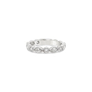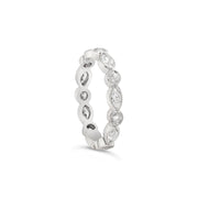 A mixed-cut diamond ring featuring alternating marquise cut and round brilliant cut diamonds framed by a milgrain bezel setting.