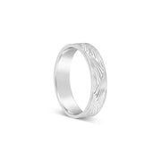 A hand engraved ring featuring an Art Deco inspired pattern throughout on a flat profiled ring with fine milgrained edges, 5mm wide. Crafted in platinum.