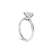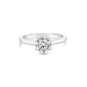 A classic solitaire engagement ring featuring a sparkling round brilliant cut diamond in a six claw setting, elegantly mounted on a knife-edge band crafted in a precious metal.