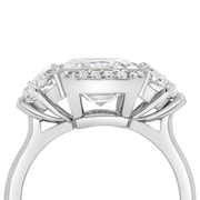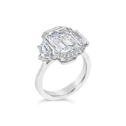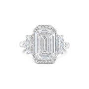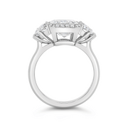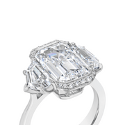 A three stone engagement ring featuring an semi-bezel set emerald cut diamond framed by a thread-set diamond halo. Cadillac diamonds adorn the central gemstone and are mounted on an upswept open shoulder, tapered band. Crafted in platinum.