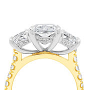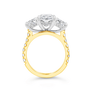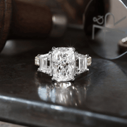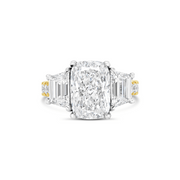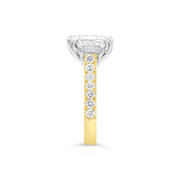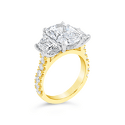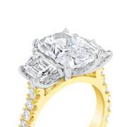A three stone engagement ring featuring a claw set elongated cushion cut diamond framed on either side by trapezoid cut diamonds and hidden halo feature. Crafted from 18ct yellow and white gold.
